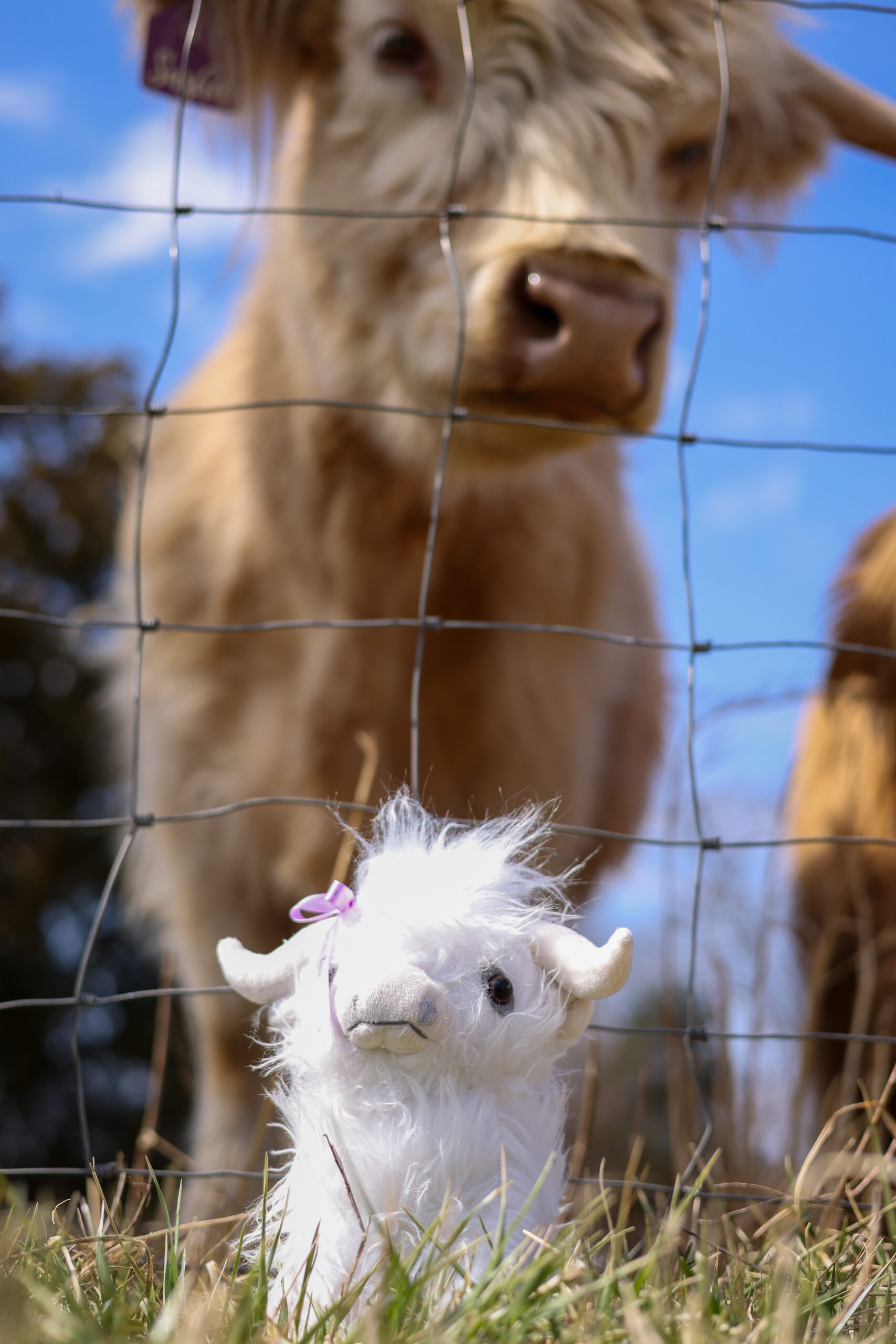 Sweet Highland Cow Stuffie with Lavender Kisses Farm ribbon in their hair.  Looks like some of our Moo Crew.
